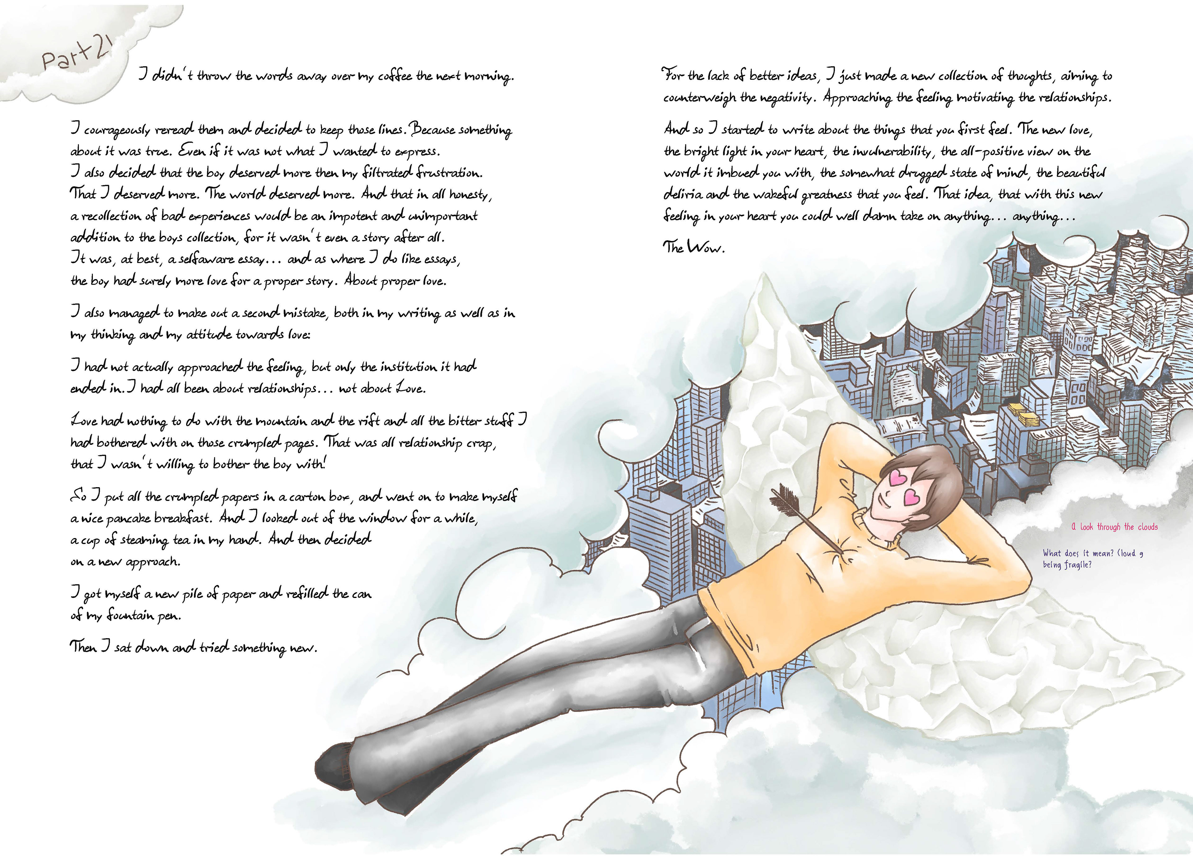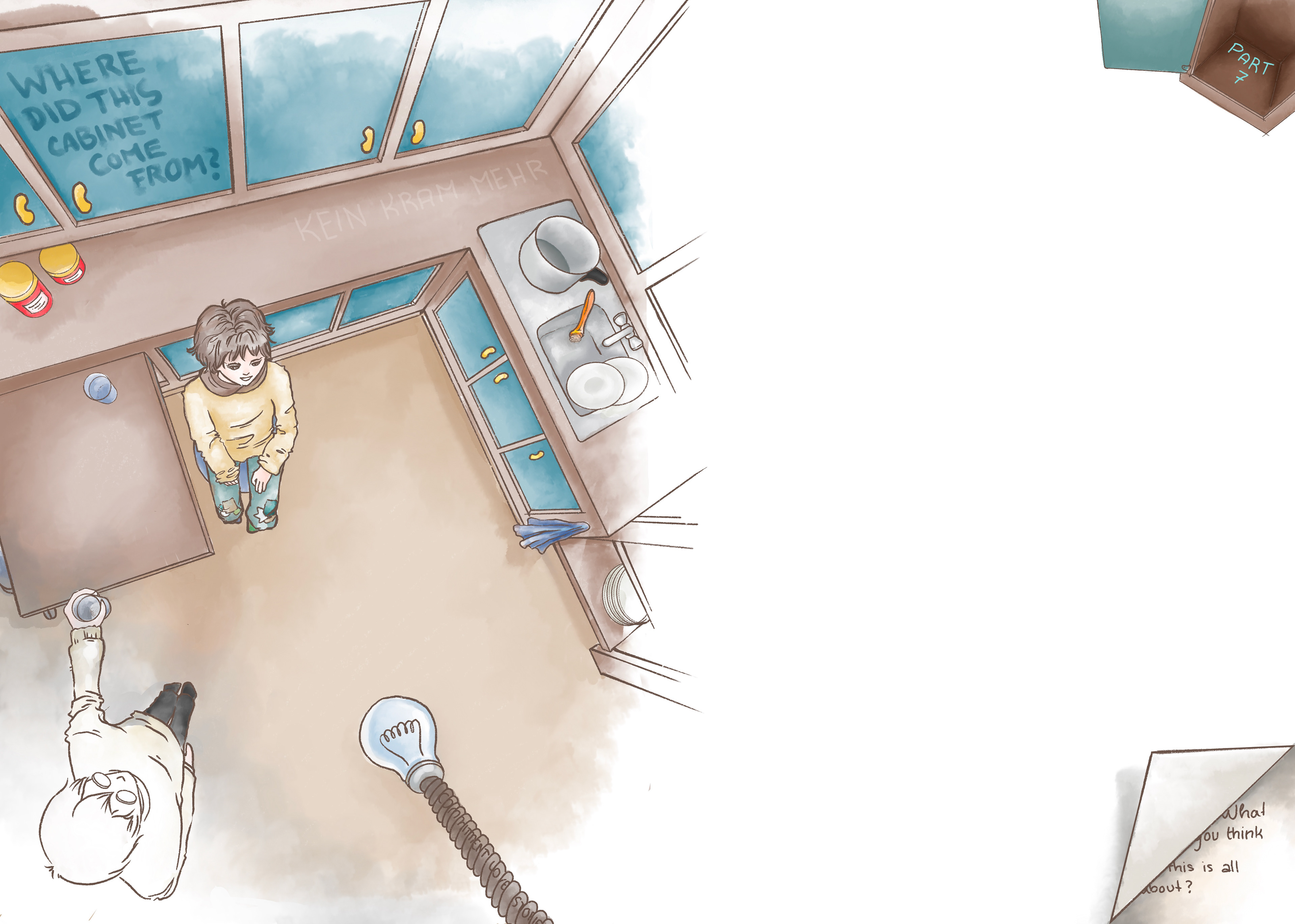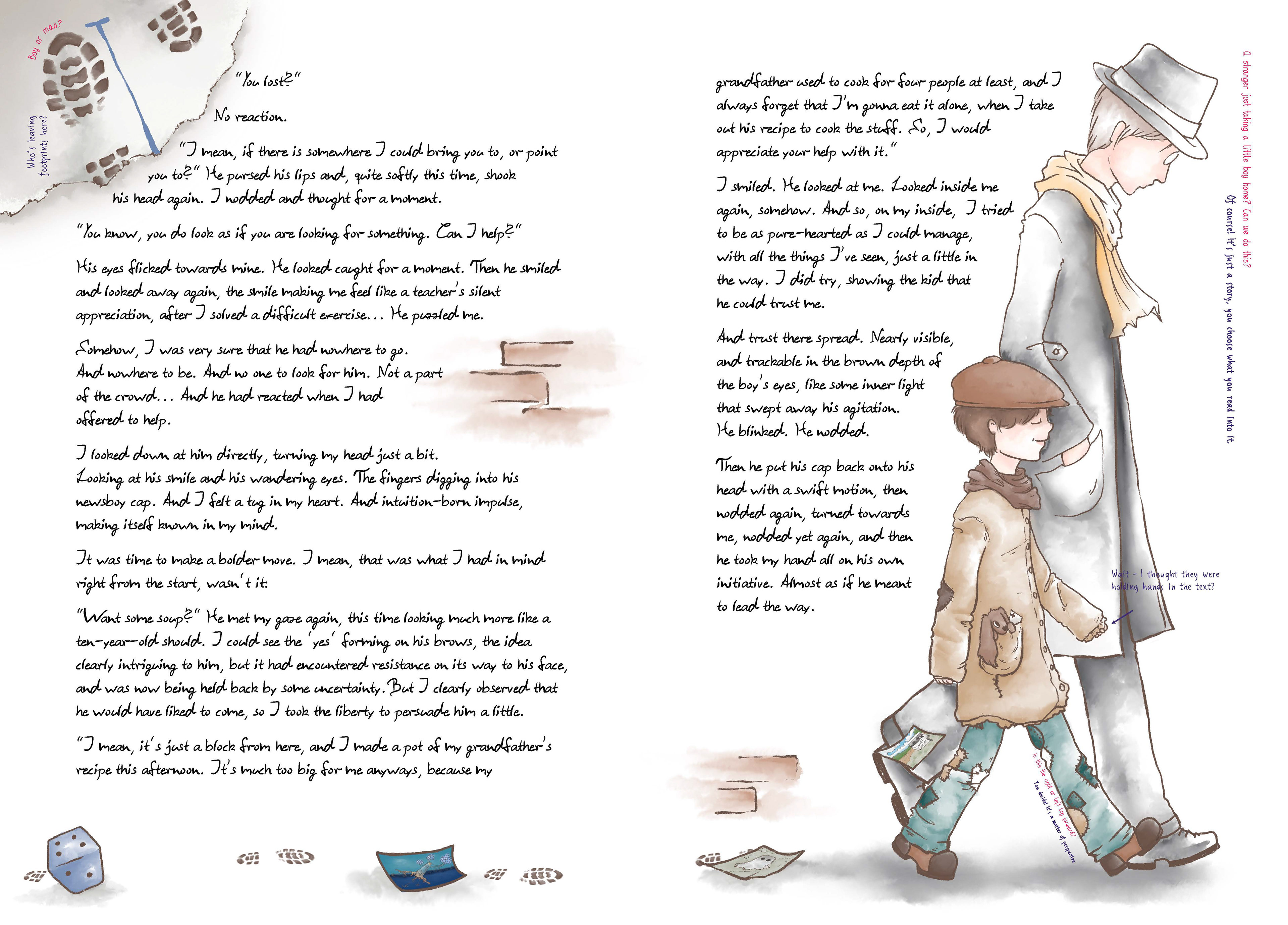 The story moves between sweetness, innocence, melancholy, and quiet searching. These qualities are intentionally mirrored in the visual language. Text and illustration are not treated as separate layers, but as interdependent elements that comment on and expand one another. Additional meta elements, such as visual side notes, references to images or text passages, and deliberately ambiguous “mistakes”, function like editorial annotations. They are meant as subtle prompts for reflection rather than explicit explanations.