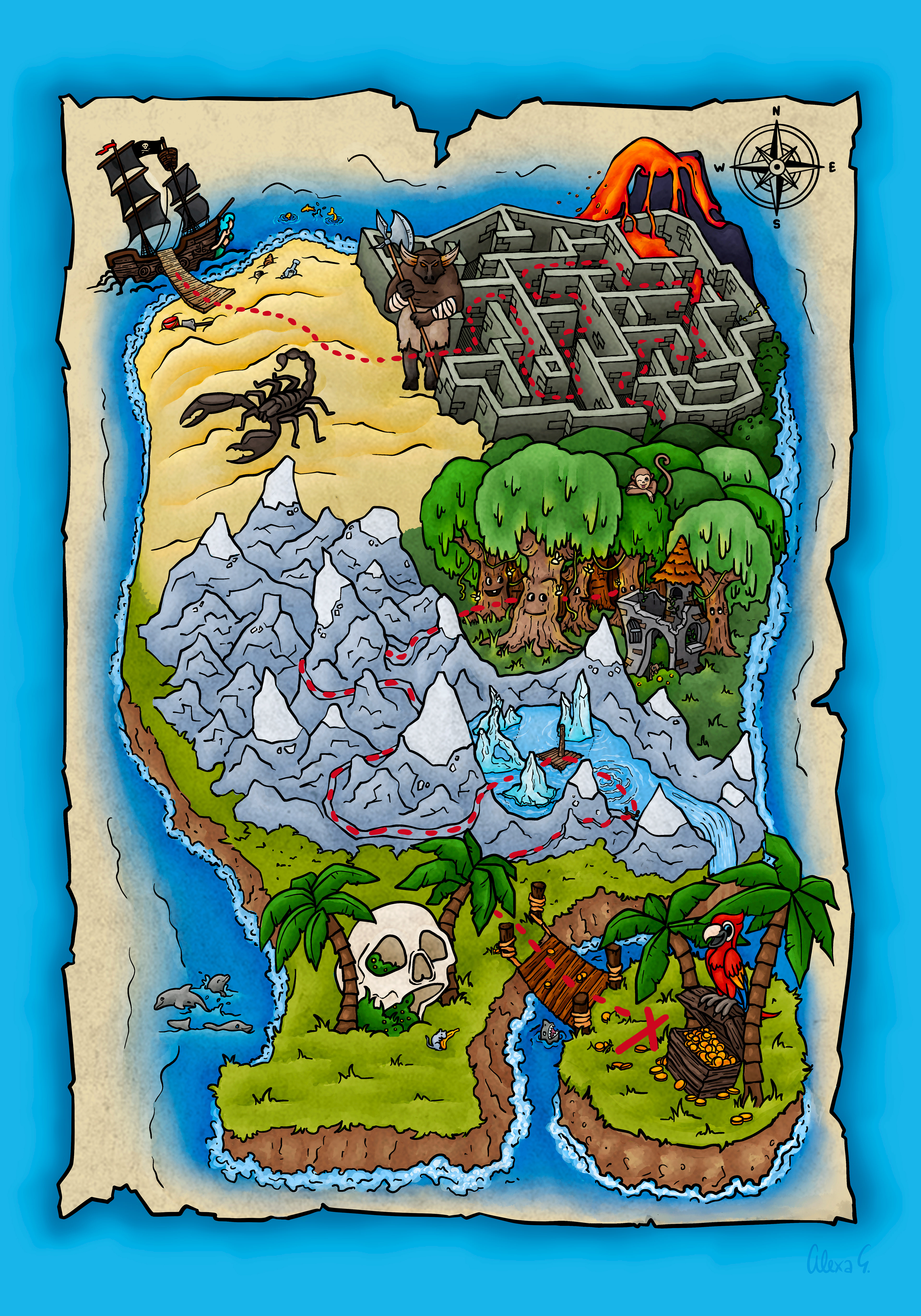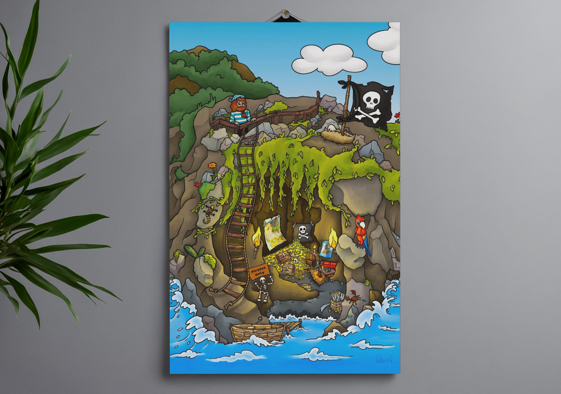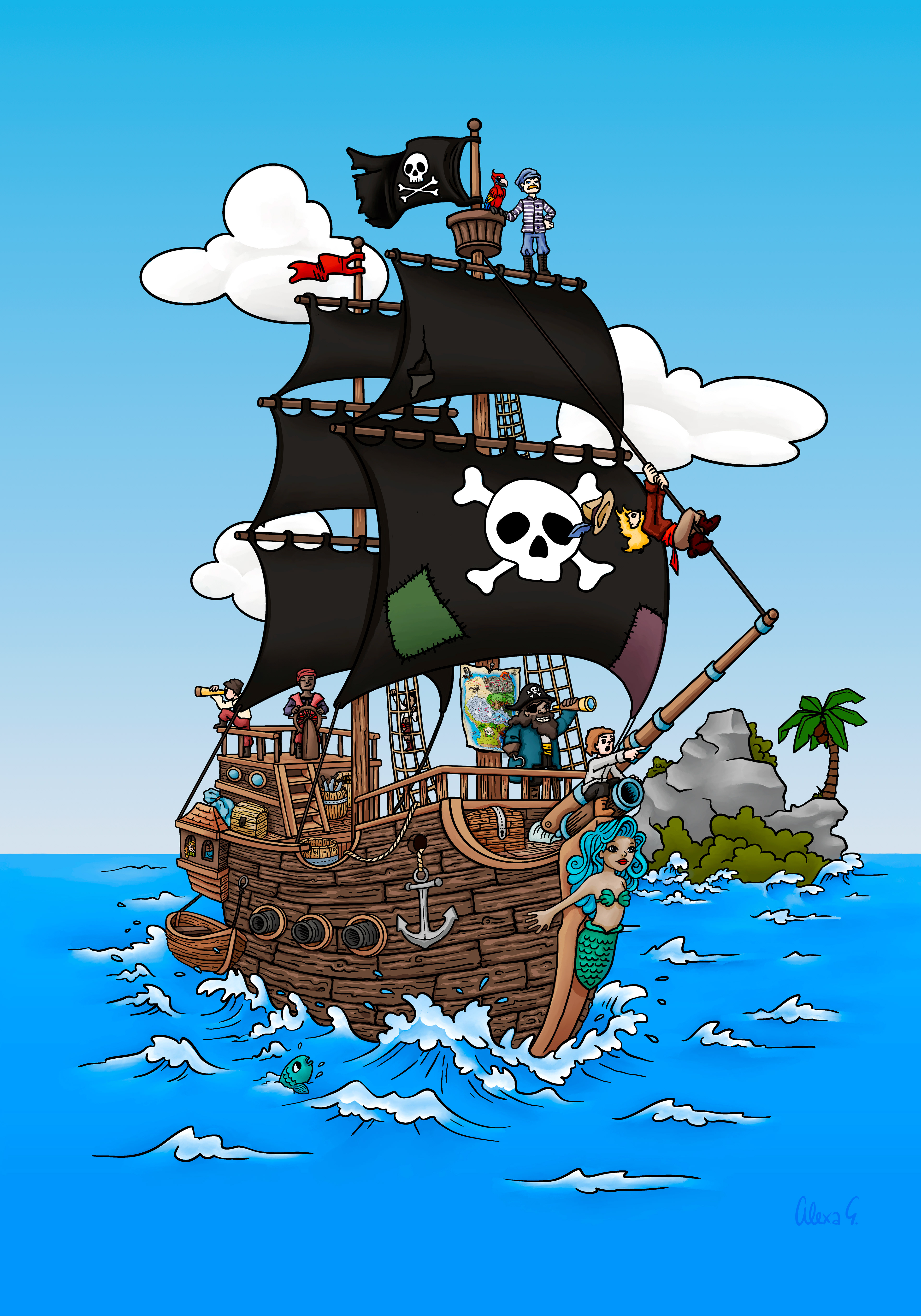 For Black Forest Artworks, I created a set of three hand-drawn pirate-themed posters for children aged 6 to 10. The goal was to create illustrations that feel inviting and fun, spark imagination, and encourage kids to invent their own stories while exploring the scenes and discovering small details.